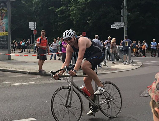 Der Schwimmstart war ein Wasserstart, alle Teilnehmer waren in der unsauberen Spree, ich war recht dicht an der Startlinie und dachte ich wäre auch etwas am Rand, um die 750 Meter zu absolvieren. Aber nach dem Start merkte ich schnell, dass ziemlich ordentlich im Gedränge war. Hatte bis zur zweiten Boje zu kämpfen etwas Ruhe zu erlangen, doch dann war es sehr entspannt und ich glaube auch die Sonne kam etwas raus. Der Wechsel aufs Rad verlief etwas holprig, da doch einige mit mir zugleich aus dem Wasser kamen und es dementsprechend eng in den Gängen des Wechselgartens wurde. Aber neben leichten Remplern und kleinen Flüchen war alles reibungslos abgelaufen.